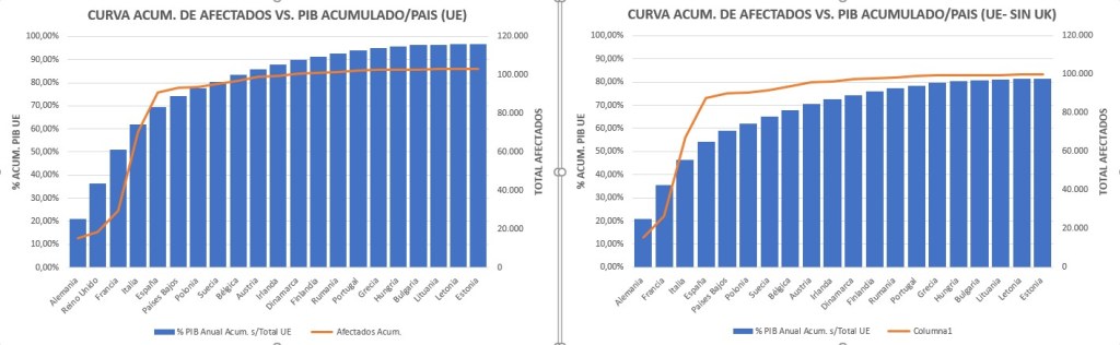 Como se puede ver en el gráfico anterior, los países más afectados de la UE, suman, incluyendo a UK, el 70% del PIB de la UE (gráfico de la izquierda). Si quitamos a UK, los países mas afectados (Italia, España, Francia y Alemania) representan el 54% del PIB de la UE. ¿Que creen ustedes que le va a pasar a una UE sin UK, cuando el 54% de su PIB, sencillamente, se congela?