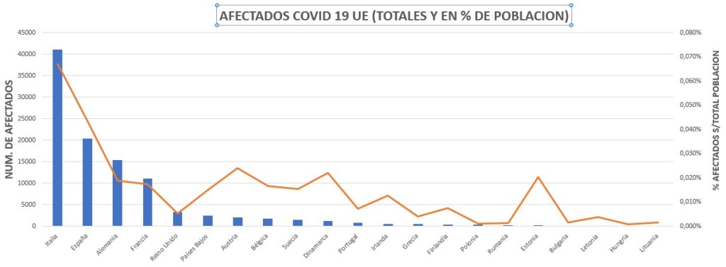 Permítame el lector, añadir un ultimo análisis. Dado el impacto del virus en la economía mundial, se justifica un primer analisis economico en relación con la expansion del virus. Ya sabemos que el impacto mas importante se ha dado en Europa, y por tanto, , dada la condicion de pais en salida de la UE, y aun mas justificado, por la baja tasa de impacto del COVID 19 enUK, desde el punto de vista poblacional (tal y como hemos indicado antes), cabe plantearse en este punto, en la busqueda un analisis economico que compare el impacto en la UE sin incluir a UK
