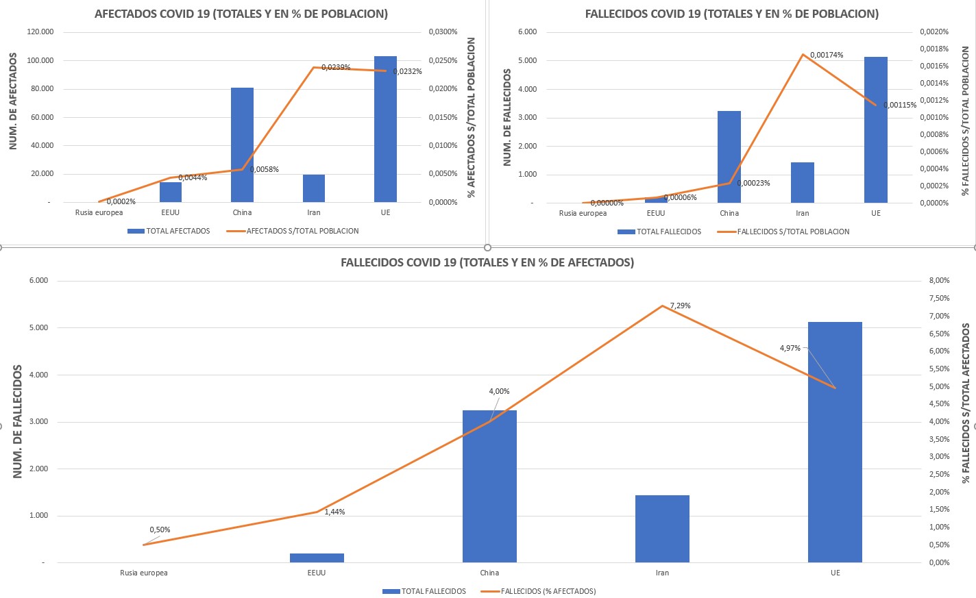 Como se puede apreciar en el gráfico anterior, no hay prácticamente impacto en Rusia, y el impacto en EEUU, es solo de un 1,44% de la población. Absolutamente incomparable, con el 4% de China, el 4,97% de la UE, o el 7,29% de Irán. Curioso, por tanto, que se declare emergencia nacional en un país con menos del 2% de afectación.