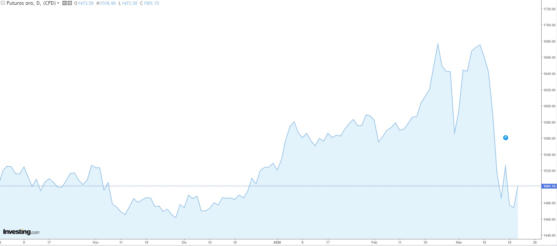 Finalmente, en tiempos de crisis, metales como el oro se convierten en un refugio de los inversores. Veamos la evolución del oro en los últimos meses: