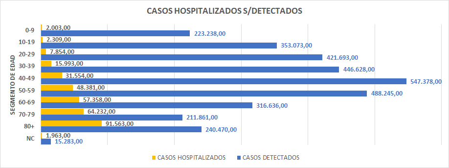 Si procedemos a analizar ahora los casos que requieren hospitalización sobre los casos «diagnosticados» o «detectados», tal y como indica la grafica siguiente, dividido en segmentos de edad, podemos obtener unas cuentas conclusiones evidentes.