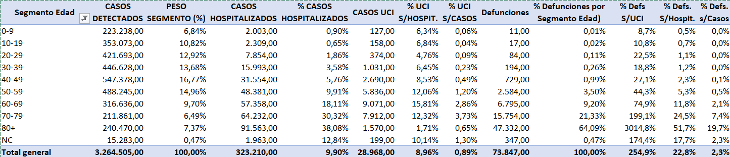 Por ello, podemos concluir con bastante solidez, que el fenómeno COVID es un fenómeno sanitario que afecta fundamentalmente a mayores de 70 años (85,43% del total de defunciones), y que se convierte en un problema de gestión sanitaria, especialmente en aquellos casos graves de entre 50 y 70 años que necesitan cuidados intensivos. Y en todo caso, la alta mortalidad en UCIs nos indica que el perfil del paciente que fallece por COVID, es un perfil de paciente cuya capacidad de superar una infección vírica (esto es, la capacidad de su sistema inmunitario) es mínima, debido a la edad, o a enfermedades o condiciones de salud anteriores.