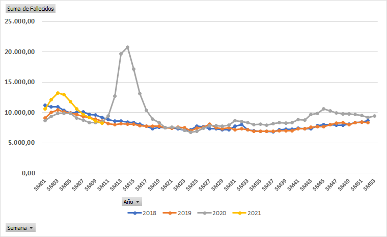 En referencia a la pregunta anterior, se está utilizando un dato comparativo entre años, que se conoce como «Exceso de Mortalidad». Este datos se puede calcular usando los datos de fallecimientos semanales registrados por el INE.