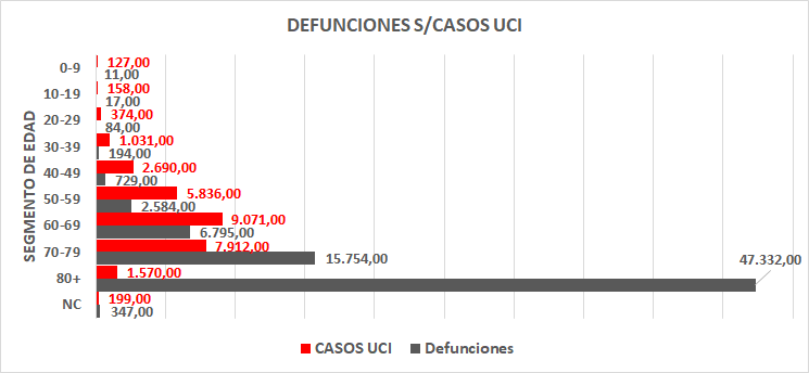 Es importante destacar aquí, que el 85,43% de las defunciones, suceden en personas mayores de 70 años. En el caso del segmento de edad de 70-79 años, hay un 199% de fallecidos sobre casos UCI. En el segmento de mas de 80 años, el porcentaje se eleva al 3.014,8%. ¿Cómo es posible?.. por la razón que explicamos más arriba: la mayoría de enfermos de esta edad, o fallece antes de llegar a la UCI, o es filtrado por bajas posibilidades de supervivencia.