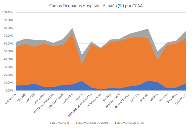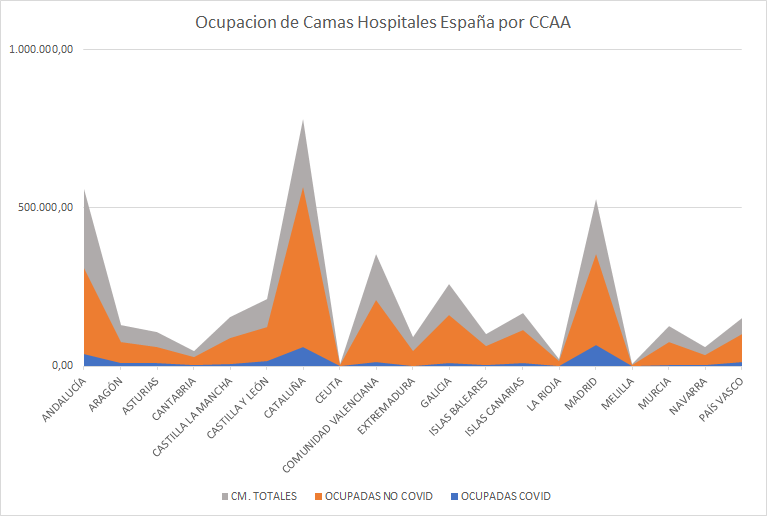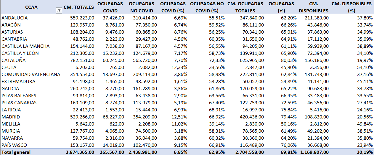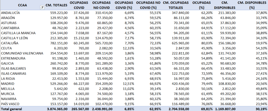 Como podemos ver en la tabla adjunta, basada, de nuevo, en los datos del Ministerio de Sanidad, en Marzo de 2021, tenemos un 30,19% de camas disponible a nivel nacional.